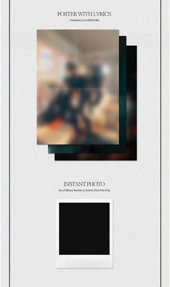 ๐ Release Date : May 23, 2023 ๐ฝ Contents : Photo Book 3 Versions / W175xH245 / 92 Pages / 1ea, CD 3 Versions / W120xH120 / 1ea, Photo Card 3 Versions / W54xH86 / Random 1ea of 7ea, Message Photo Card 3 Versions / W54xH86 / Random 1ea of 7ea, Sticker 1 Version / W100xH148 / 1ea, Postcard 3 Versions / W170xH120 / Random 1ea of 7ea Bookmark, 3 Versions / W45xH120 / 1ea, Poster with Lyrics 3 Versions / W250xH360 / 1ea