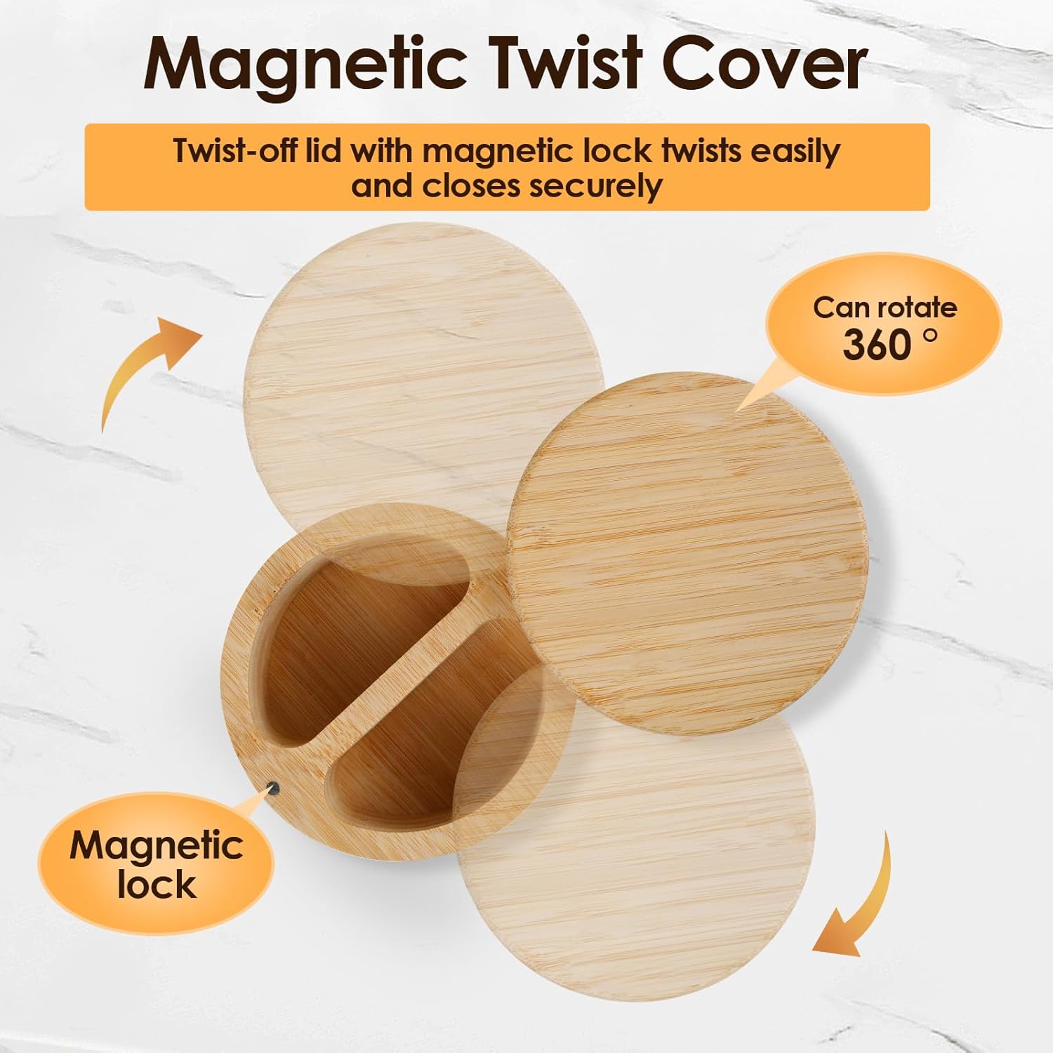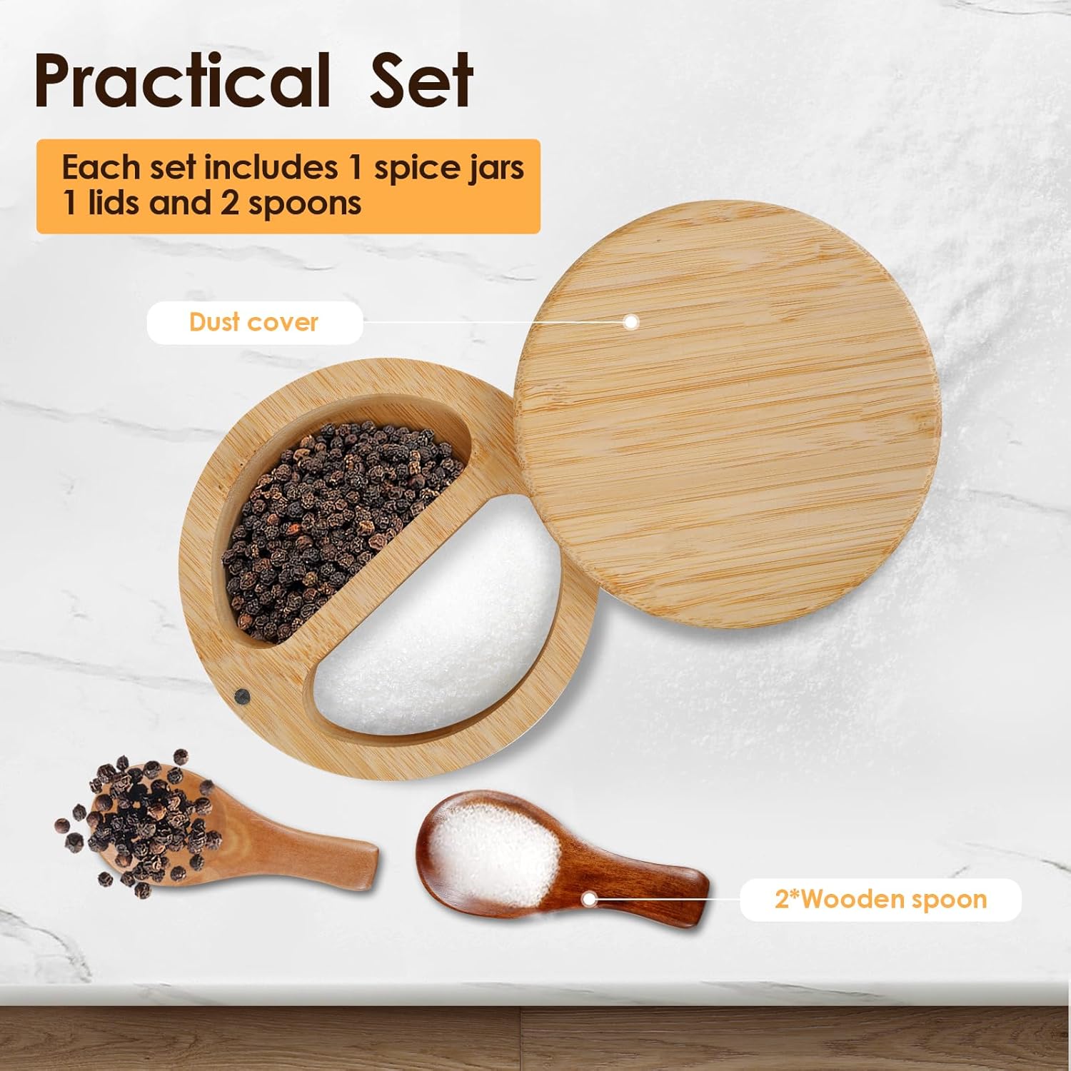 Parts List:1 × Salt Spice Box2 × SpoonsDescription:This salt and pepper bowl is crafted from bamboo with a and natural texture that is both beautiful and functional. It is designed with two compartments to hold different salts or spices to keep seasonings fresh and dry.Key Feature:Practical Spice Organizer: This salt and pepper box is designed with 2 compartments to hold different spices separately. It also comes with 2 spoons for easier access to the seasonings.Easy to Open: This spice box comes with a rotating magnetic lid, which is easy to open with one hand, very convenient.Specification:Product Name: Salt Spice BoxMaterial: BambooSize:Salt Spice Box: 12 x 12 x 6 cm / 4.7 x 4.7 x 2.36 inchesSpoon: 8 x 3.3 cm / 3.15 x 1.3 inchesNote:1. This item is not suitable for children 13 years old and under.2.There may be slight differences between the picture and the actual color of the commodity. We will try our best to show you the exact color.3.Please allow slight dimension differences due to manual measurement.