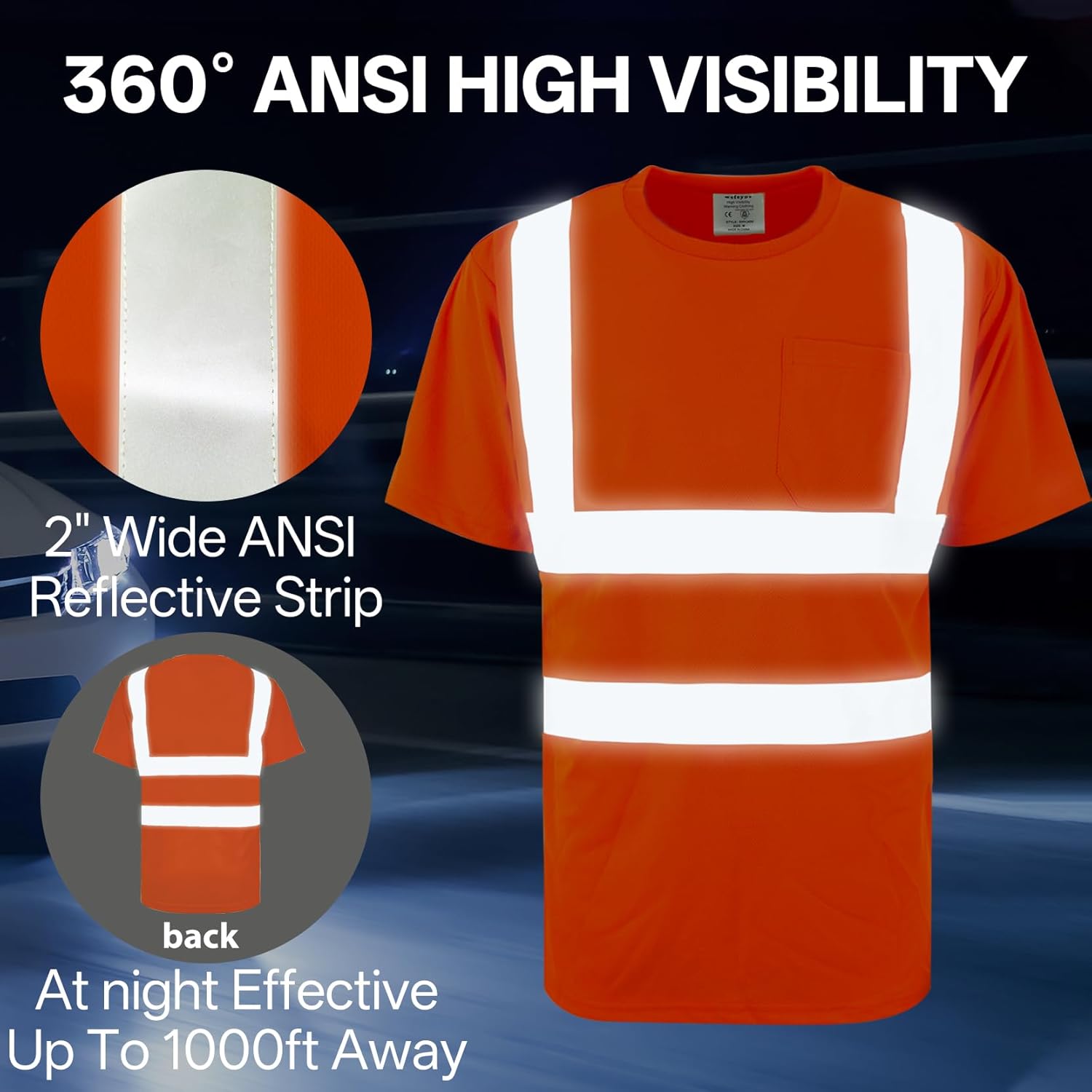 Our reflective shirts for men are crafted with a crew neck and short sleeves design, ensuring both comfort and ease of movement for the wearer. The safety work shirts for men are made with a durable, high visibility material that includes a 360-degree, 2-inch wide reflective strip along the bottom, significantly enhancing visibility in low-light conditions and reducing the risk of accidents. Additionally, the yellow work shirts feature a multifunctional pocket on the left chest, perfect for storing essentials like a cellphone, wallet, and ID card. The reflective clothing is highly versatile and ideal for a range of industries such as safety, construction, traffic control, airports, ports, railways, warehouses, logistics, surveying, and paving. It's also well-suited for volunteers, making it a reliable choice for anyone needing increased safety across both professional and recreational settings.